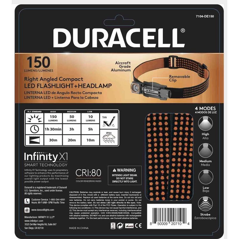 - VIVID ILLUMINATION: Powerful and incredibly bright 150 Lumen Duracell Right-Angled LED Flashlight and Headlamp combo with IPX4 water resistance to withstand even the most extreme weather conditions