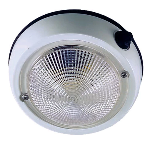 White powdercoat over chrome-plated zinc, with a black vinyl mounting gasket. Double-contact bayonet socket and push switch with water-resistant boot.