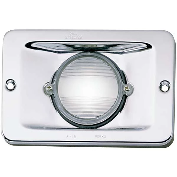 Stainless steel vertical flush mount stern light with a black polymer base.