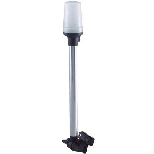 Fold-down, adjustable angle. Horizontal mount with 3/4″dia. anodized aluminum tube, white translucent globe and black plastic base. Includes plastic adapters for flat or “V” type mounting. Contains notch for through-base wiring.