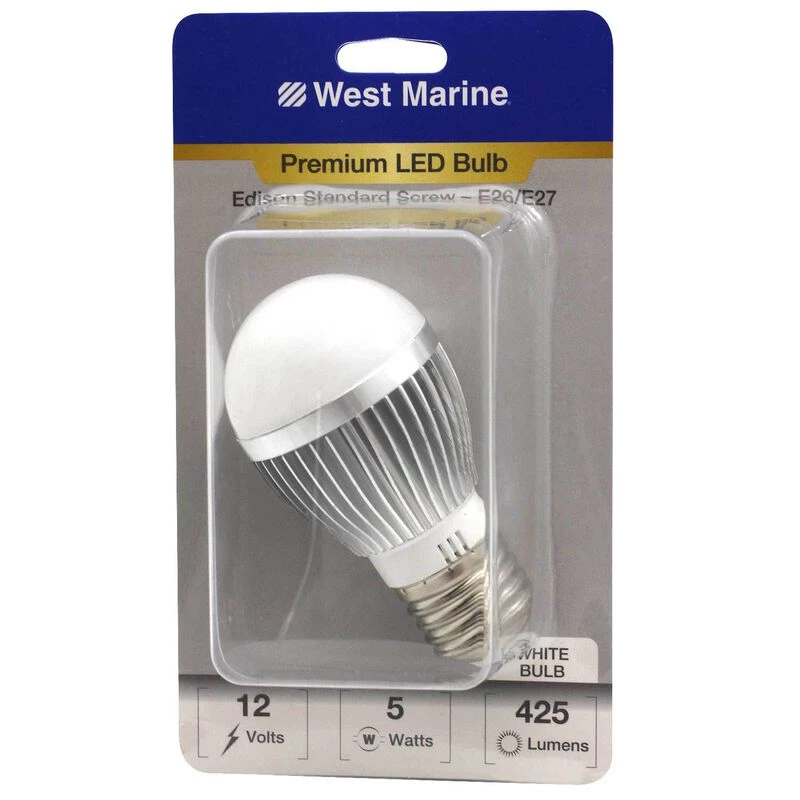 The WEST MARINE Edison Standard Screw E26/E27 LED Premium Bulb uses cutting edge LED chips, drivers and construction offering the highest levels of performance, efficiency, and reliability. This results in dramatically reduced power consumption while having greater light output than the majority of bulbs of its size. It will produce bright flicker free light which will render true and vibrant colors, and reduce eyestrain compared to lower quality LED bulbs. This is achieved using high efficiency chips and drivers which produce more light output per watt of power consumed.