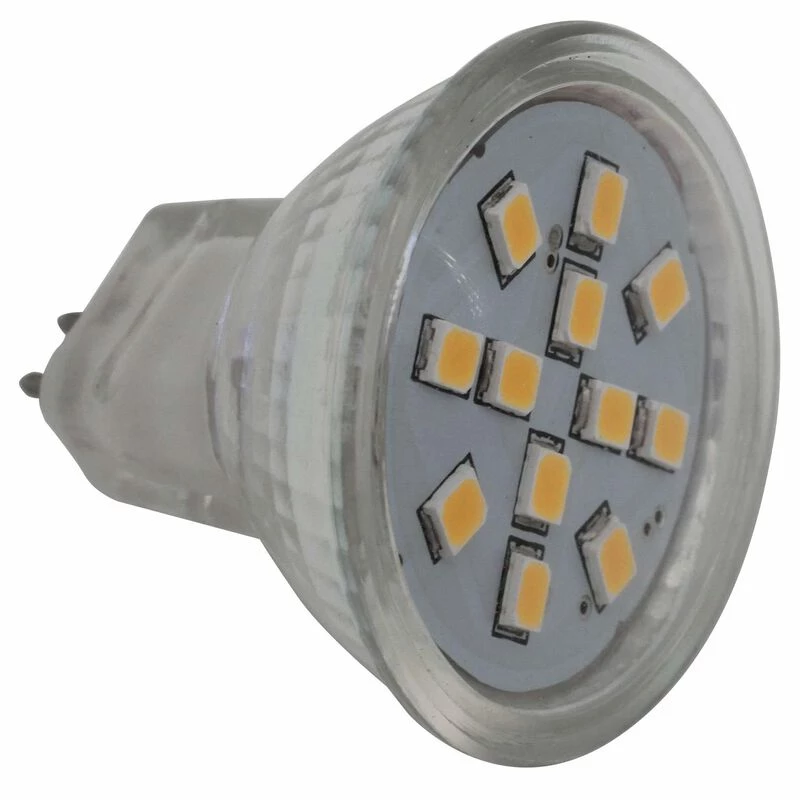 This bulb replaces and has similar brightness to 5 watt MR11 bulbs. 10-16VDC input range.