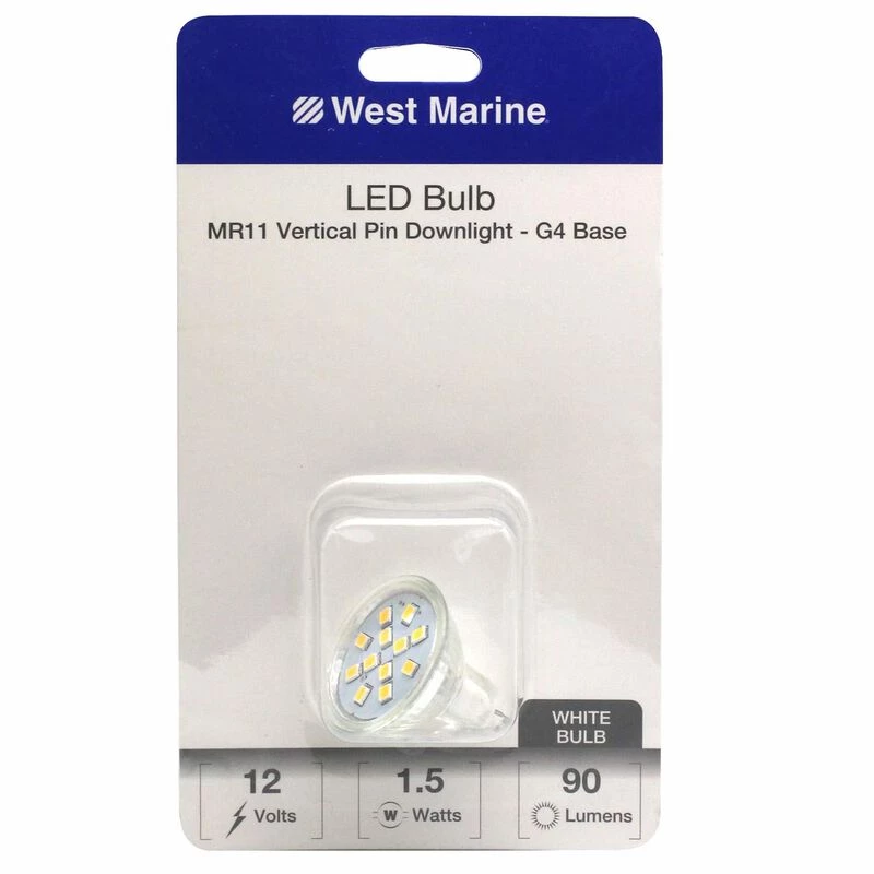 The WEST MARINE MR11 Vertical Pin Downlight G4 Base LED Bulb has been designed as a replacement and upgrade for standard halogen, Xenon and incandescent filament bulbs, offering dramatically lower power consumption and heat generation, while having much greater lifetime and shock resistance. For even greater light output and quality as well as higher efficiency (more light per watt) please look to our Premium series bulbs.