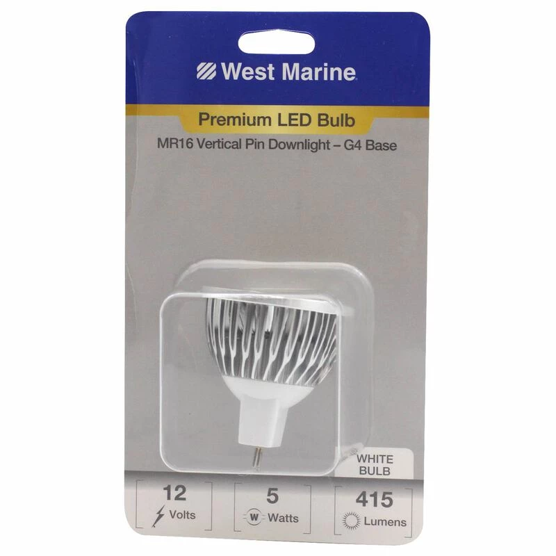 The WEST MARINE MR16 Vertical Pin Downlight G4 Base LED Premium Bulb uses cutting edge LED chips, drivers and construction offering the highest levels of performance, efficiency, and reliability. This results in dramatically reduced power consumption while having greater light output than the majority of bulbs of its size. It will produce bright flicker free light which will render true and vibrant colors, and reduce eyestrain compared to lower quality LED bulbs. This is achieved using high efficiency chips and drivers which produce more light output per watt of power consumed.